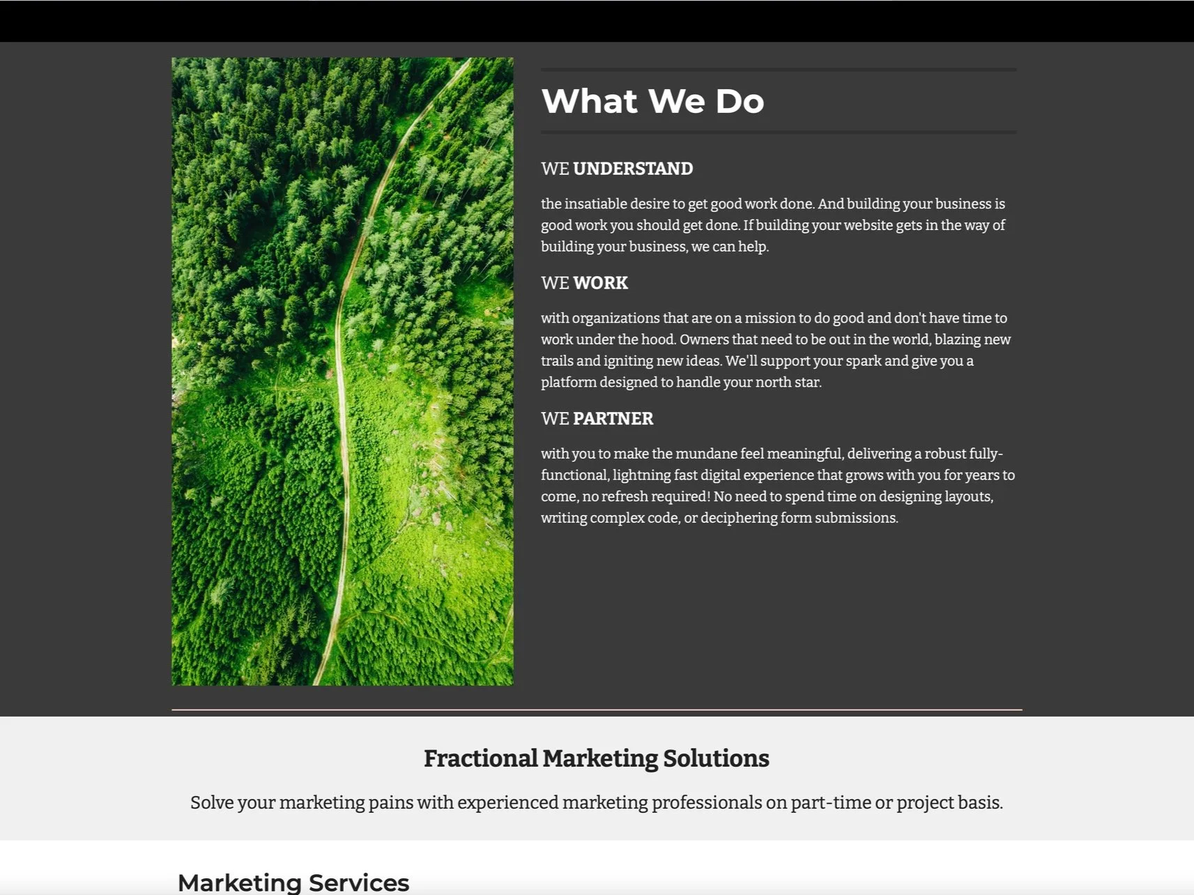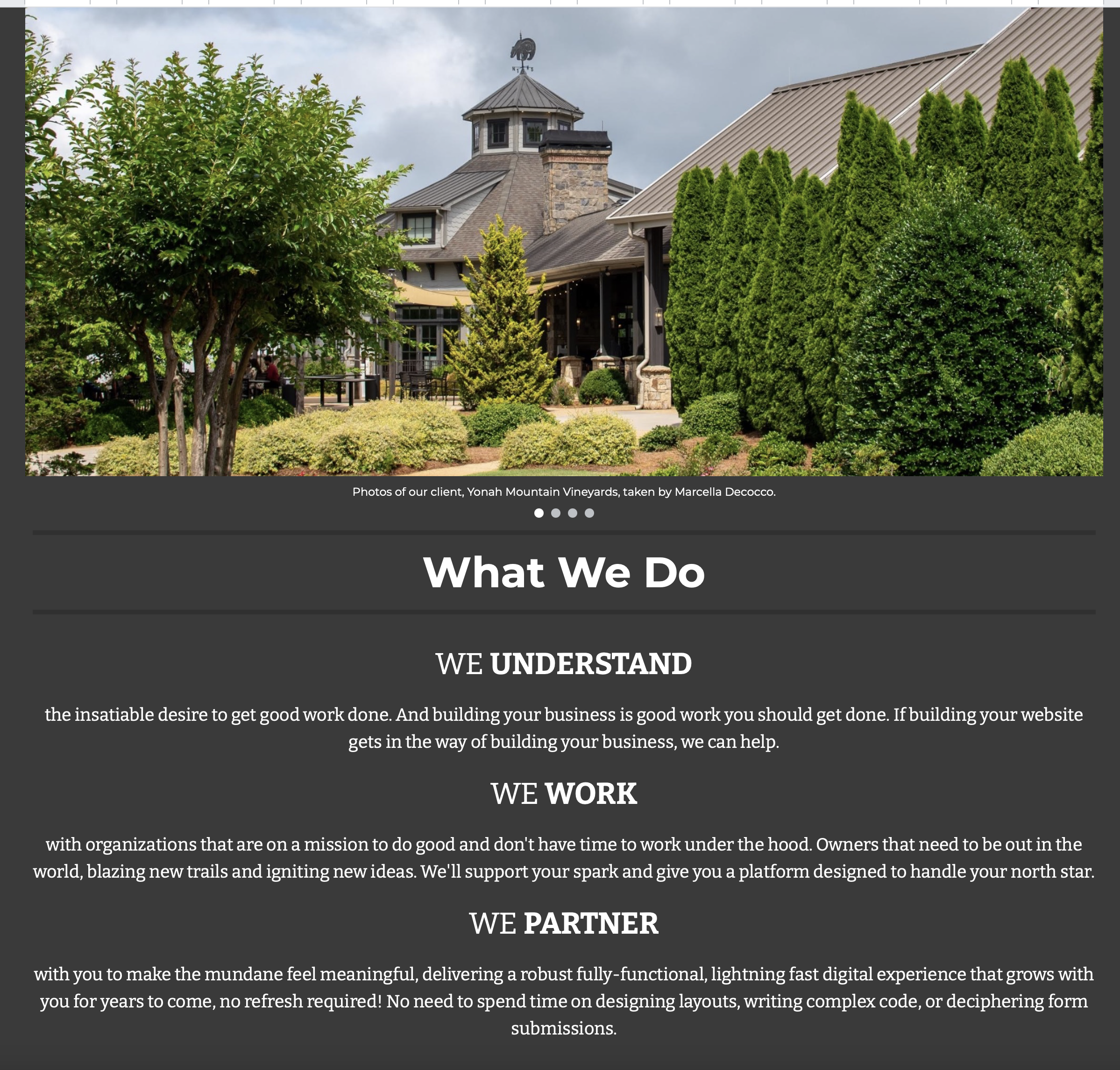 Of the features we implemented, this one was my favorite. I noticed on first glance that there was a stock image of a river on the website in the “What We Do” section. While it was a pretty picture, I felt it didn’t really speak to SparkBot’s mission, didn’t fit their color scheme, and could use an update with more relevant images.
