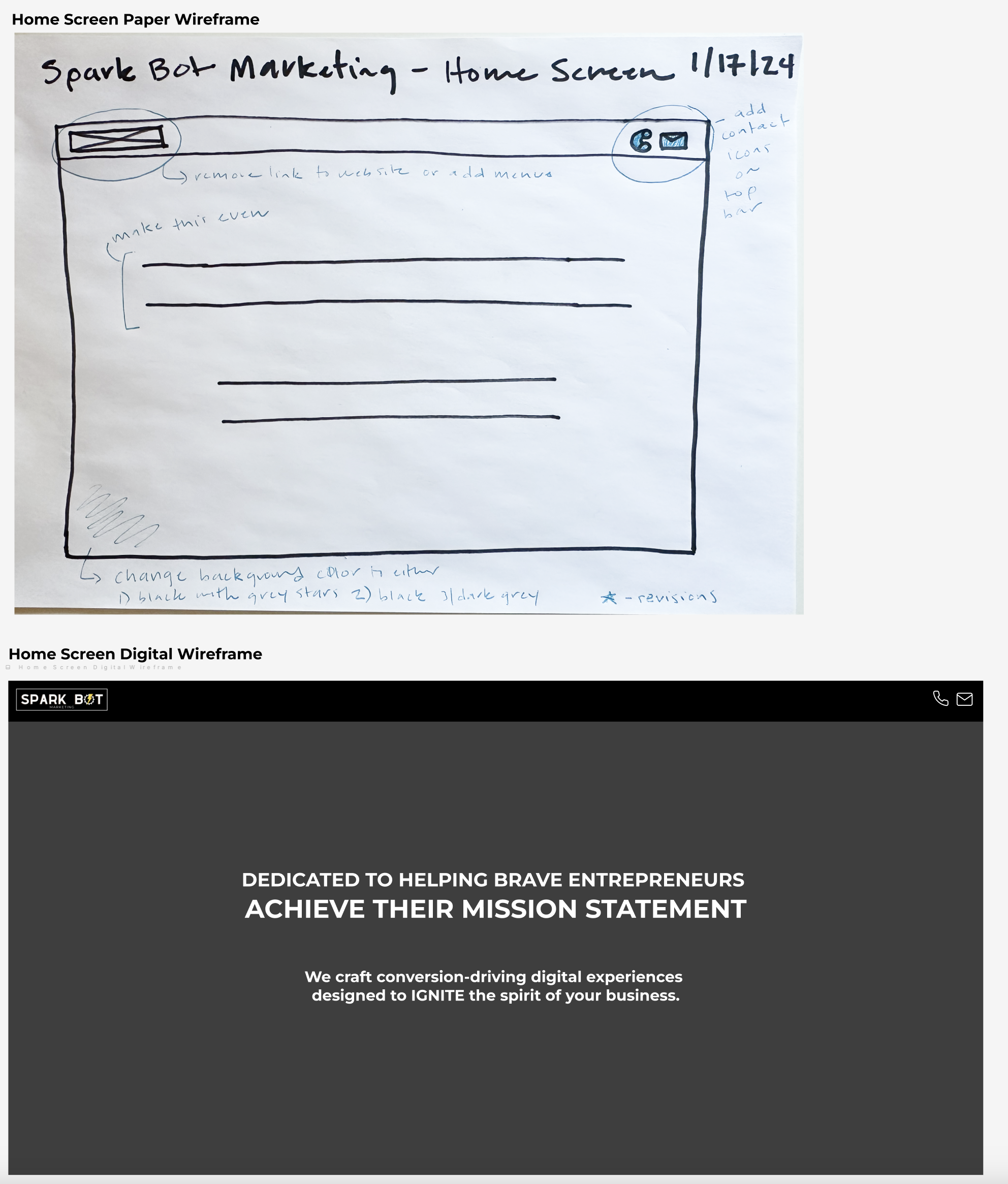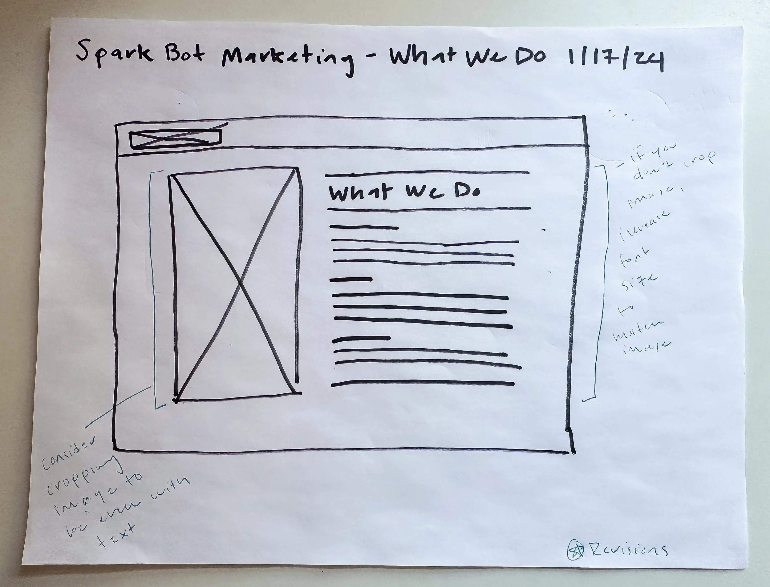 So, I swapped out this picture with a rotating carousel of images from SparkBot’s actual clients. To me, this felt more personal and inviting for future SparkBot clients to look at, and made their website feel a little more approachable. I also reformatted the copy to give it a bolder impact.