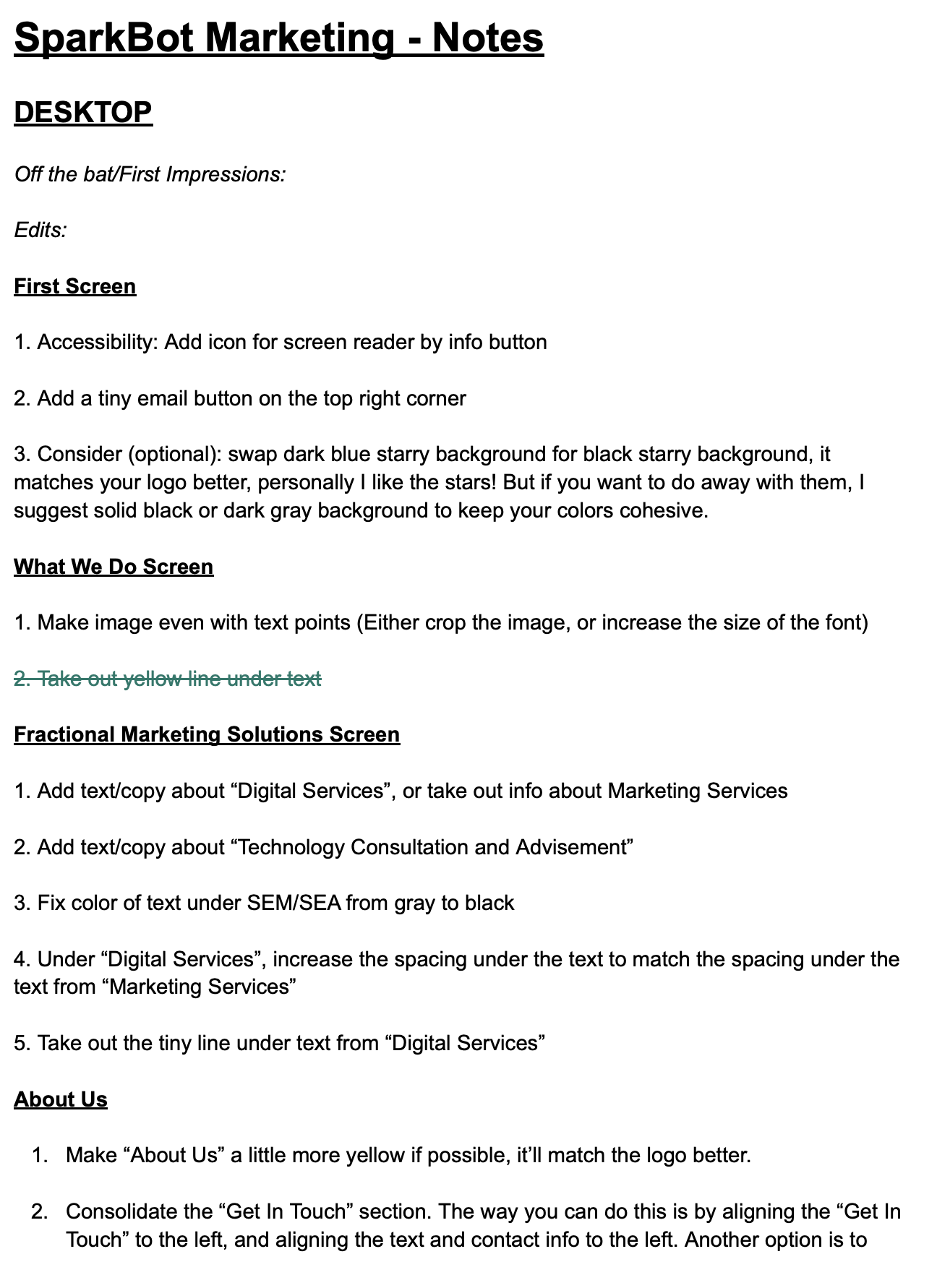 Taking all of this into consideration, I wrote out a list of potential changes I wanted to make to the homepage of the website. I used Google Docs to keep my thoughts organized and easy to share with the CEO.